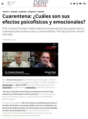 El Dr. Ernesto Crescenti fue entrevistado por Antonio Rico, periodista de DERF Agencia Federal de Noticias. A lo largo de la entrevista se habló de temas oncológicos y autoinmunes; principalmente de cómo se relacionan estas enfermedades con el estrés y la vida cotidiana. También se le dedicó tiempo al coronavirus, pandemia que está afectando a todo el mundo, y su relación con el sistema inmunológico.